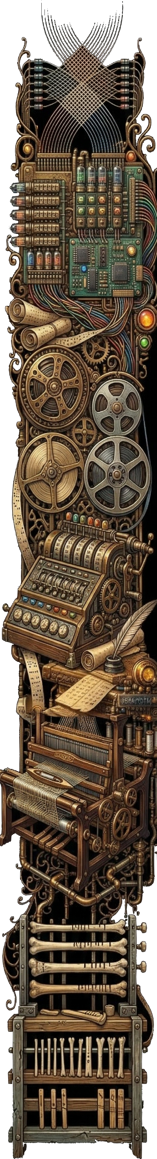 Writing followed the same pattern. It began as bureaucracy: notches on bone, marks in clay, the mundane logistics of tracking debts and harvests. Yet we are creatures who cannot help but exceed our own inventions. What started as record-keeping evolved into poetry, philosophy, and the full architecture of written thought. By giving thought a body outside ourselves, marks that could outlast us, be copied, be carried, we discovered we could leave pieces of our inner lives in the world, where they might take root in others. The punch cards of the Jacquard loom, designed for nothing grander than automating patterns in silk, inspired Babbage to give machines a language of their own, instructions encoded in presence and absence, a grammar of operations rather than words, eventually leading to the networked totality of the internet. This was a different kind of transmission, not ideas expressed, but decisions encoded, logic made executable, intent given physical operational form.